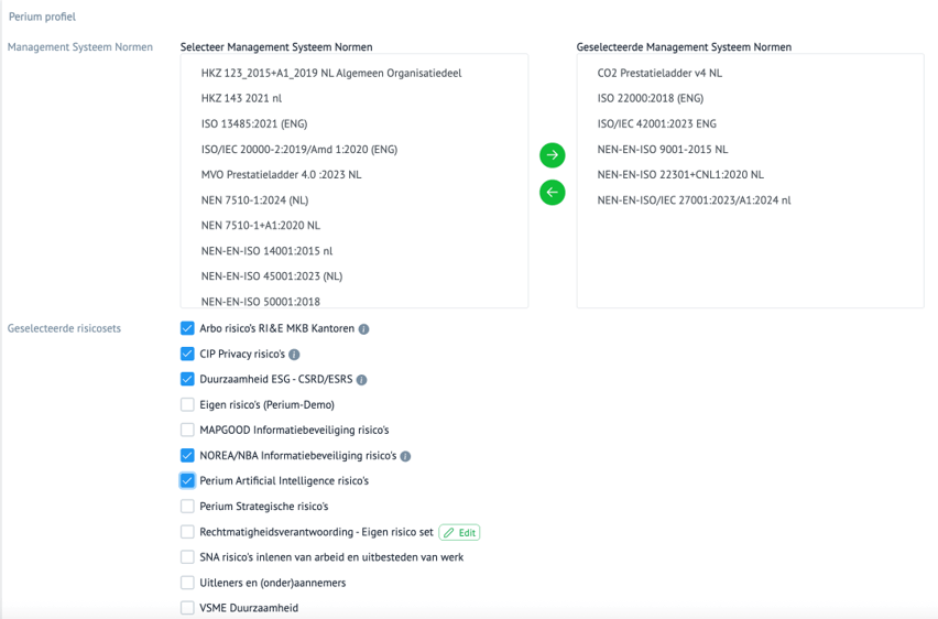 Op dit moment is een aantal (standaard) risicosets in Perium opgenomen. Regelmatigd worden nieuwe risico’s toegevoegd.