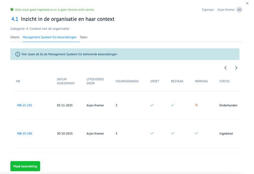 Ja, alle assessments resultaten worden overzichtelijk onder elkaar gezet. Bij het aanmaken van een nieuw assessment kun je de voorliggende assessment resultaten gebruiken. Zo kun je alleen de wijzigingen doorvoeren.